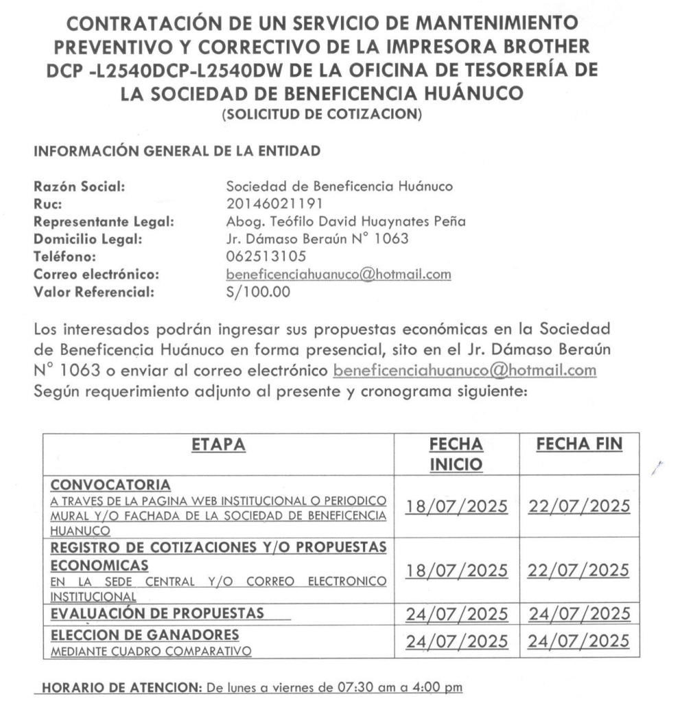 CONTRATACIÓN DE UN SERVICIO DE MANTENIMIENTO PREVENTIVO Y CORRECTIVO DE LA IMPRESORA BROTHER DCP -L2540DCP-L2540DW DE LA OFICINA DE TESORERÍA DE LA SOCIEDAD DE BENEFICENCIA HUÁNUCO.