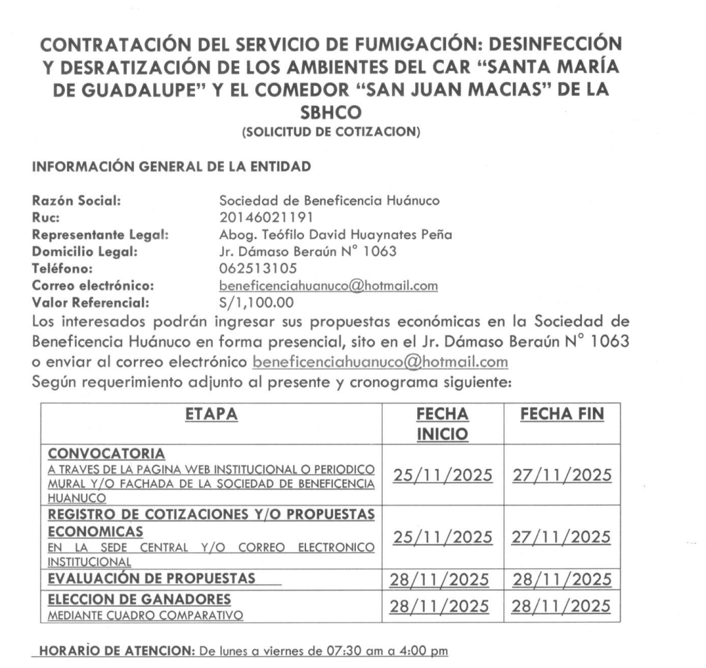 CONTRATACIÓN DEL SERVICIO DE FUMIGACIÓN: DESINFECCIÓN Y DESRATIZACIÓN DE LOS AMBIENTES DEL CAR “SANTA MARÍA DE GUADALUPE” Y EL COMEDOR “SAN JUAN MACIAS” DE LA SBHCO.