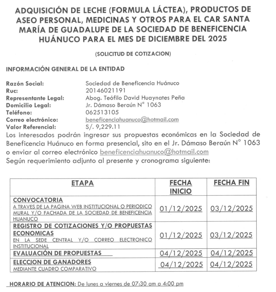 ADQUISICIÓN DE LECHE (FORMULA LÁCTEA), PRODUCTOS DE ASEO PERSONAL, MEDICINAS Y OTROS PARA EL CAR SANTA MARÍA DE GUADALUPE DE LA SOCIEDAD DE BENEFICENCIA HUÁNUCO PARA EL MES DE DICIEMBRE DEL 2025.