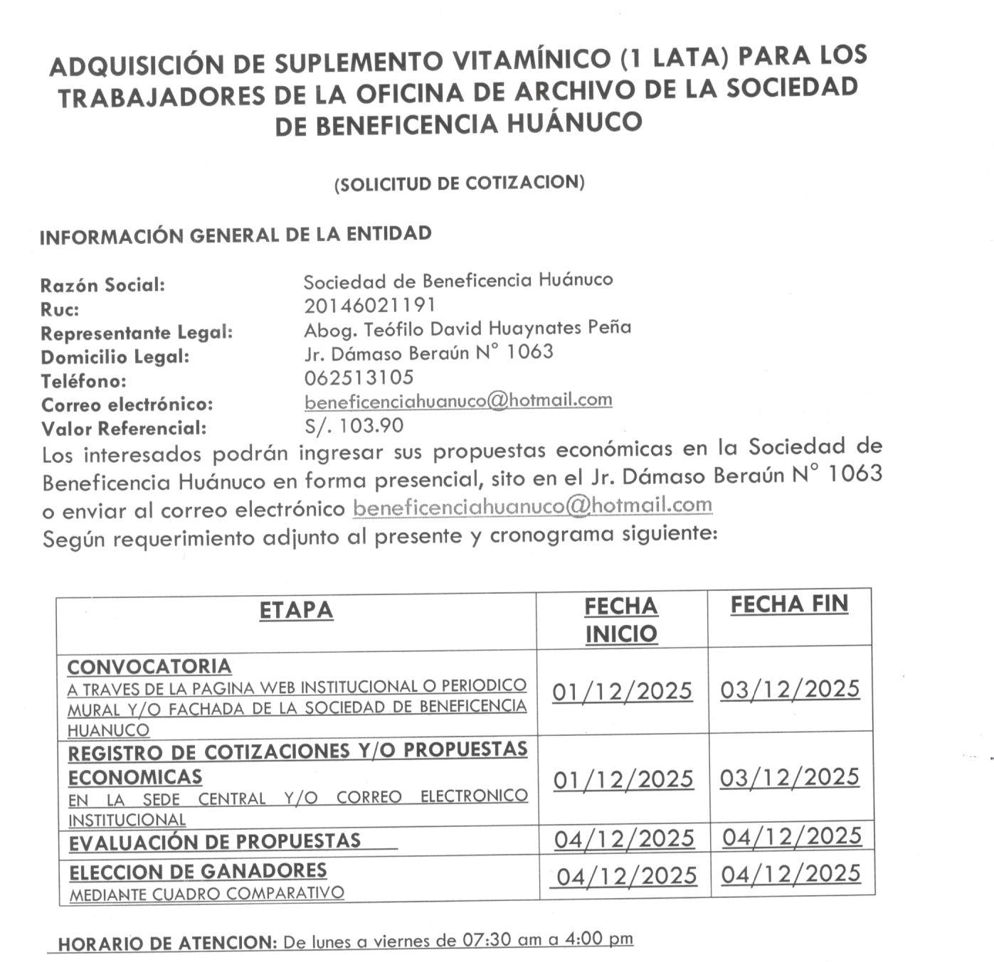 ADQUISICIÓN DE SUPLEMENTO VITAMÍNICO (1 LATA) PARA LOS TRABAJADORES DE LA OFICINA DE ARCHIVO DE LA SOCIEDAD DE BENEFICENCIA HUÁNUCO.