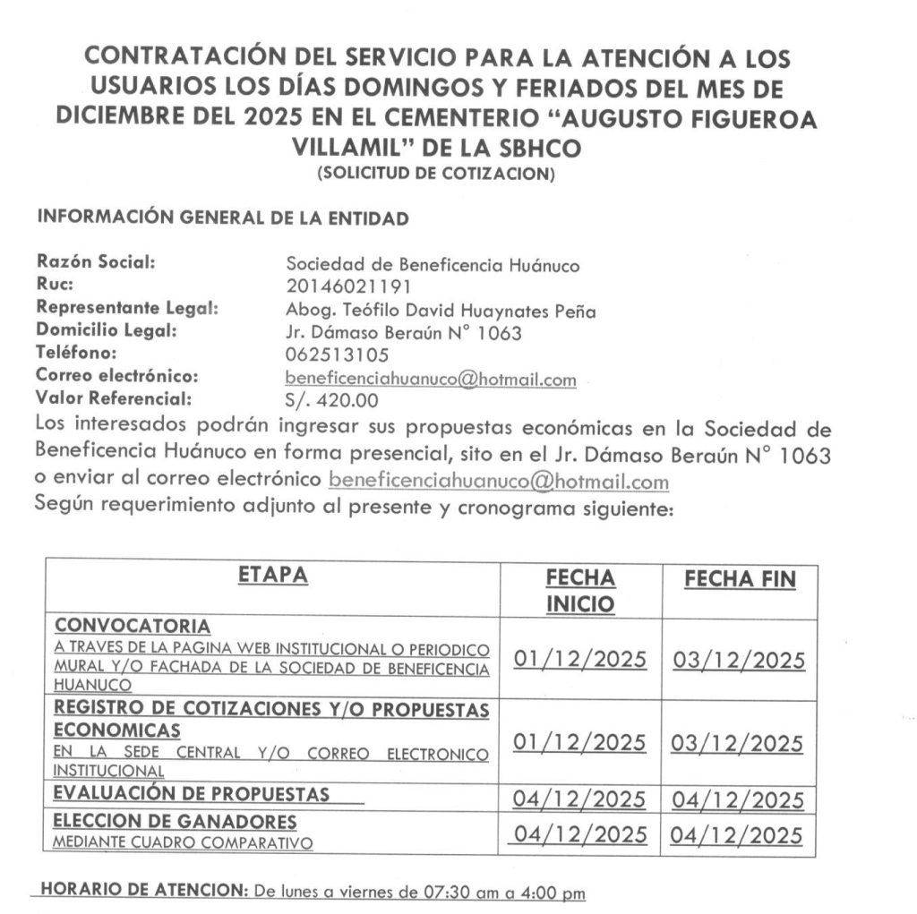CONTRATACIÓN DEL SERVICIO PARA LA ATENCIÓN A LOS USUARIOS LOS DÍAS DOMINGOS Y FERIADOS DEL MES DE DICIEMBRE DEL 2025 EN EL CEMENTERIO “AUGUSTO FIGUEROA VILLAMIL” DE LA SBHCO.