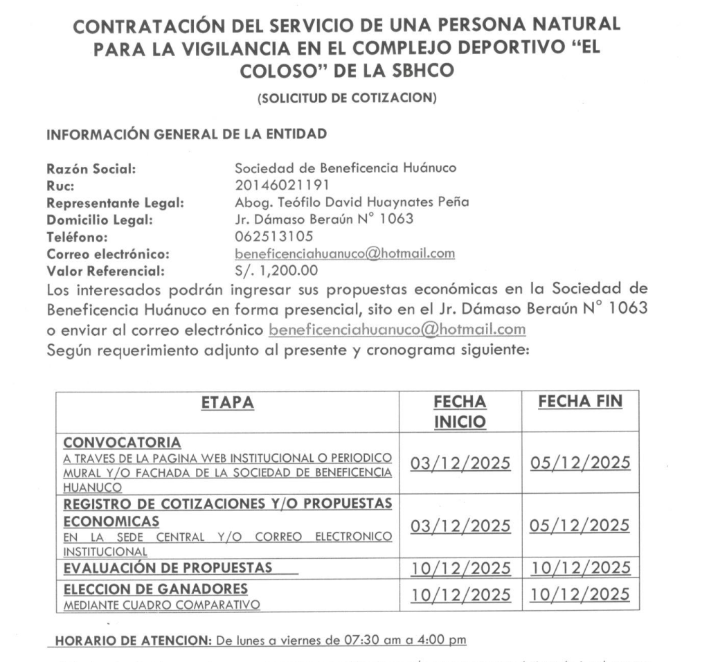 CONTRATACIÓN DEL SERVICIO DE UNA PERSONA NATURAL PARA LA VIGILANCIA EN EL COMPLEJO DEPORTIVO “EL COLOSO” DE LA SBHCO.